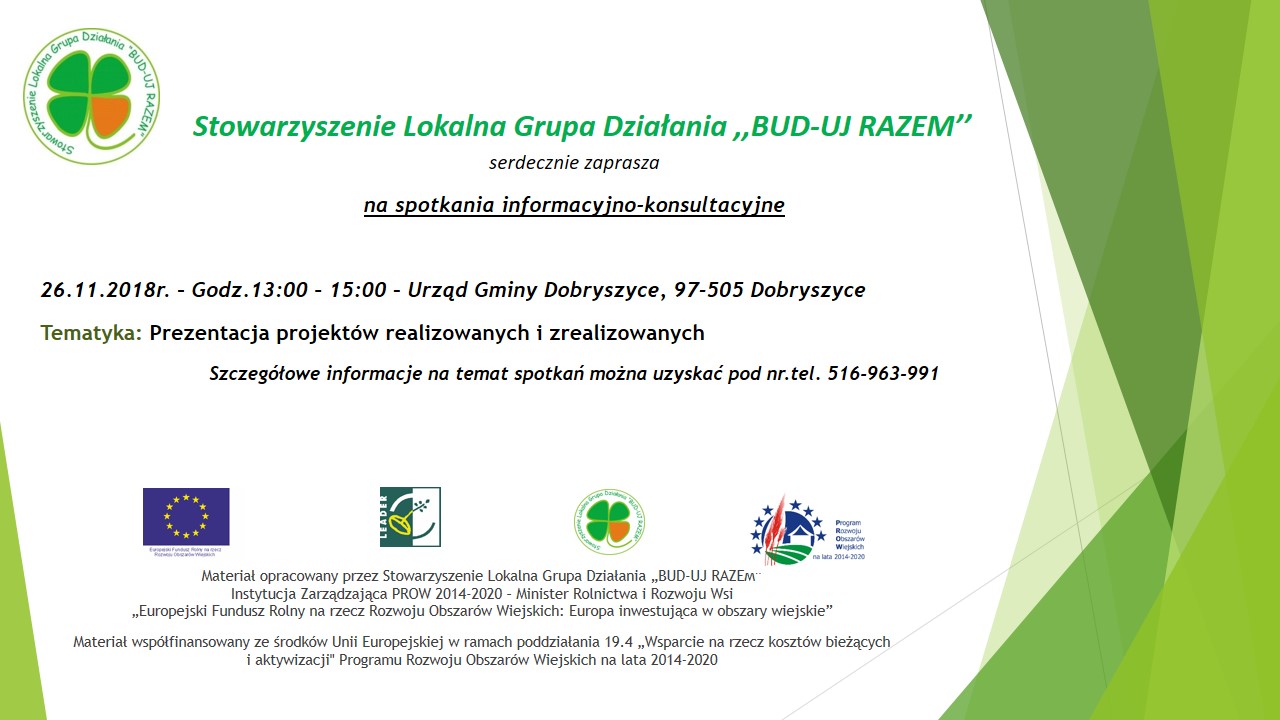 SPOTKANIA INFORMACYJNO-KONSULTACYJNE DLA MIESZKAŃCÓW OBSZARU DZIAŁANIA STOWARZYSZENIA LOKALNA GRUPA DZIAŁANIA „BUD-UJ RAZEM”